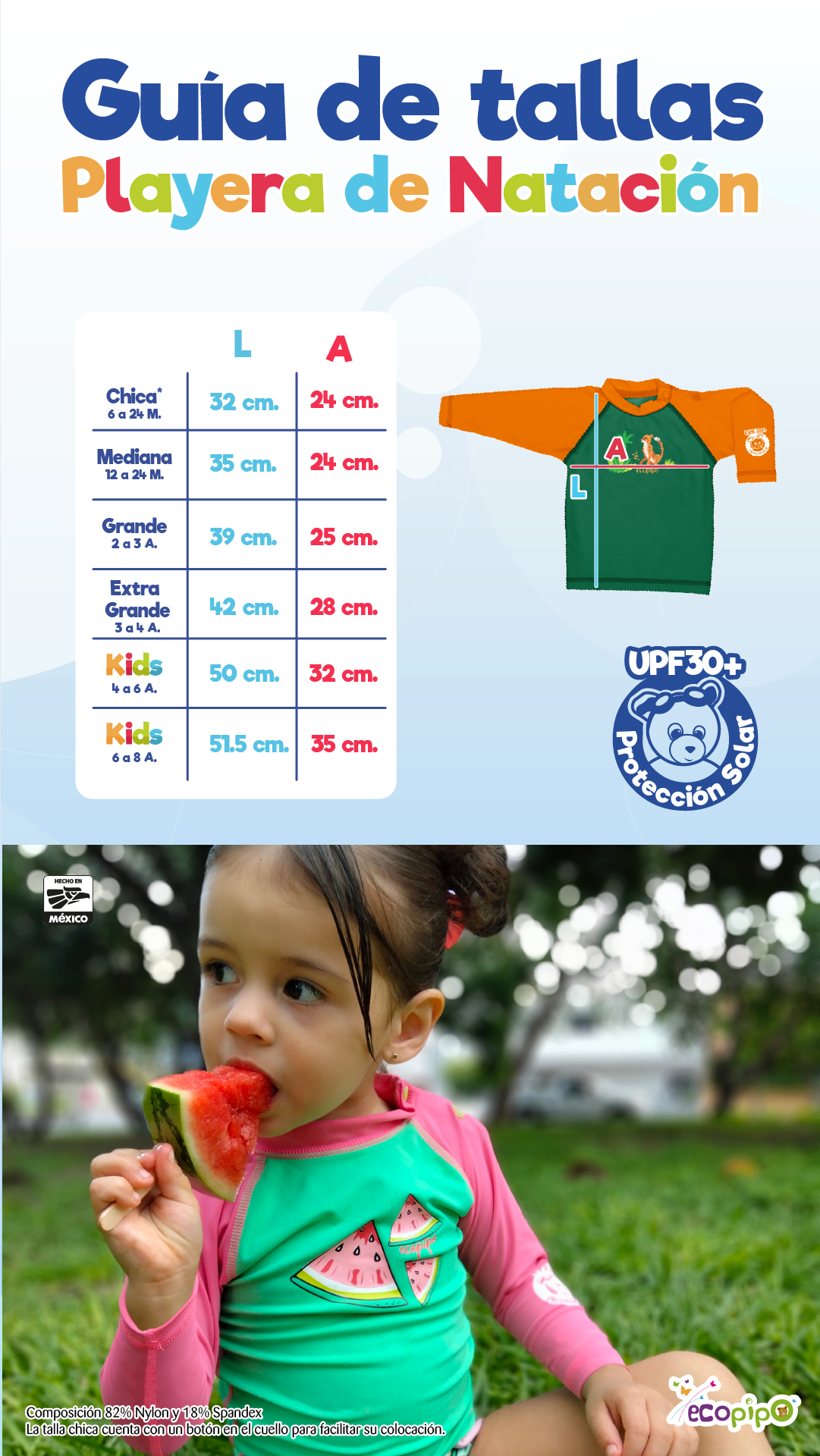 Nuestras playeras cuentan con factor protección solar (FPS) que protegerá a tu bebé de los rayos UV, brindándote diversión sin límites.